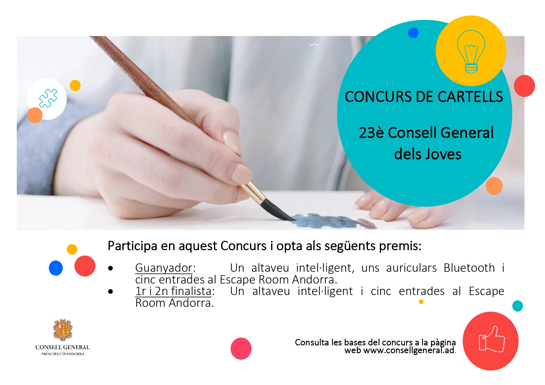 El Consell General convoca un concurs d'idees per al disseny del cartell de la 23ª edició del Consell General dels Joves. S’hi poden presentar propostes de cartells amb qualsevol material o tècnica (foto, pintura, dibuix, collage, imatge digital).