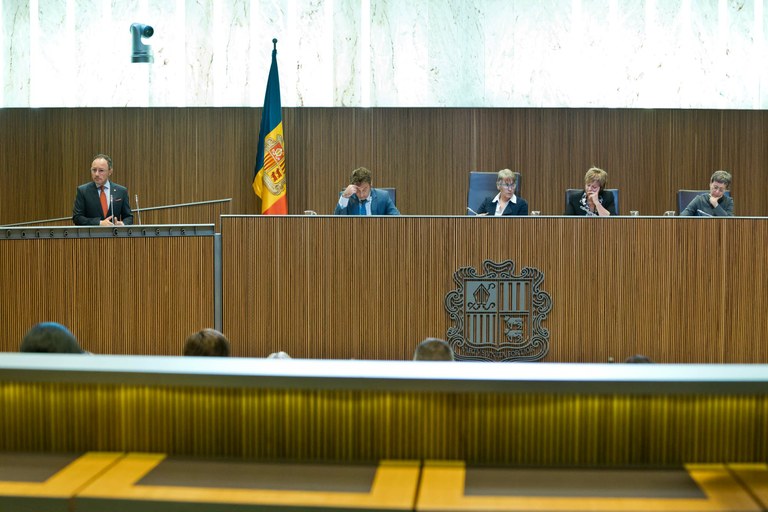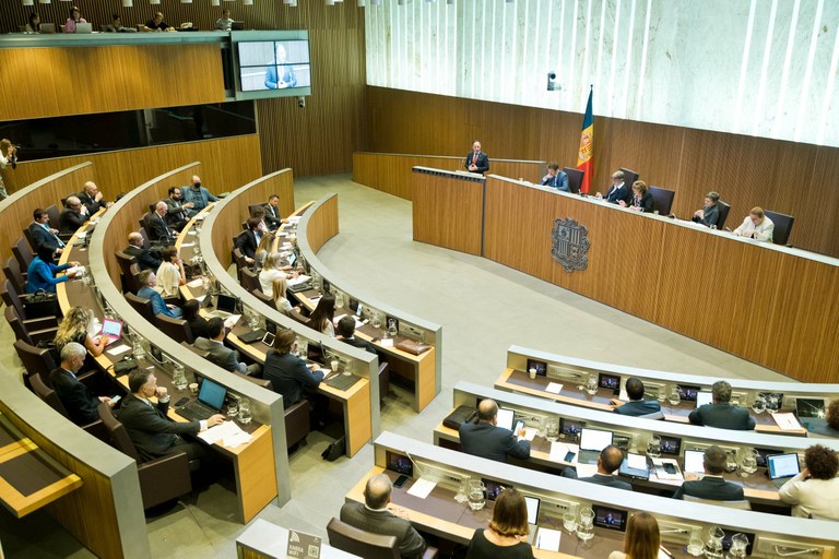 La sessió s’ha reprès puntualment i la primera en intervenir davant del Ple ha estat la consellera no adscrita, Carine Montaner, seguidament ho ha fet el president del grup parlamentari Ciutadans Compromesos, Carles Naudi, el president grup parlamentari Terceravia + Unió Laurediana + Independents, Josep Pintat, el president del grup parlamentari Liberal, Ferran Costa, el president del grup parlamentari Socialdemòcrata, Pere López, i ha tancat el torn d’intervencions el president del grup parlamentari Demòcrata, Carles Enseñat.