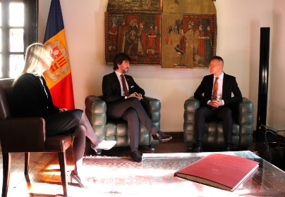 El síndic general, Carles Ensenyat, i la subsíndica general, Sandra Codina, han rebut al ministre d'Afers Exteriors i Comerç d'Hongria, Péter Szijjártó, en el marc de la visita oficial que el mandatari hongarès està fent al Principat d'Andorra.