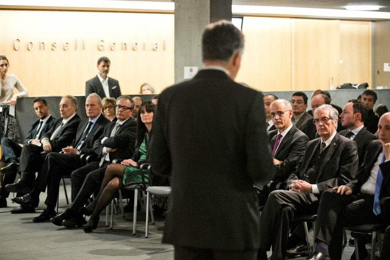 Molt bona tarda i sigueu benvinguts a aquest acte de celebració del 600 aniversari del Consell de la Terra. És per a mi un honor adreçar-vos avui unes paraules, quan es compleixen just 600 anys del privilegi del bisbe Francesc de Tovia, privilegi pel qual els prohoms de les valls d'Andorra podien escollir els seus representants per reunir-se periòdicament i tractar dels assumptes que els concernien. Sis segles d'història, amb les transformacions lògiques aparellades als canvis polítics i socials que hi ha hagut al llarg del temps, ens converteixen en un dels parlaments més antics del món.