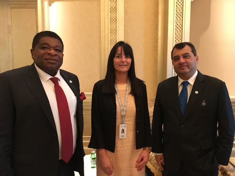 Fotografia: La subsíndica general, Mònica Bonell, amb el secretari general de la UIP, Martin Chungong (esquerra de la imatge) i el president de la UIP, Saber Chowdhury (dreta).