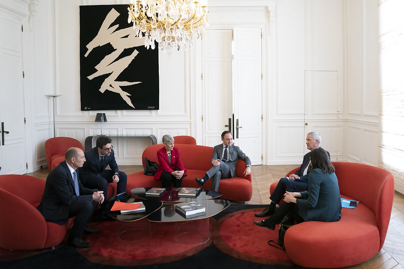 El copríncep Emmanuel Macron, la síndica general en funcions, Roser Suñé i el cap de Govern en funcions, Xavier Espot, tracten els principals reptes d’Andorra per als pròxims anys